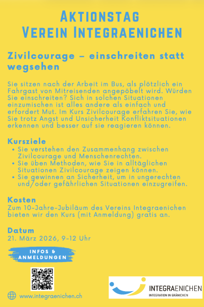 Zum 10-Jahre-Jubiläum des Vereins Integraenichen bieten wir den Kurs (mit Anmeldung) gratis an.