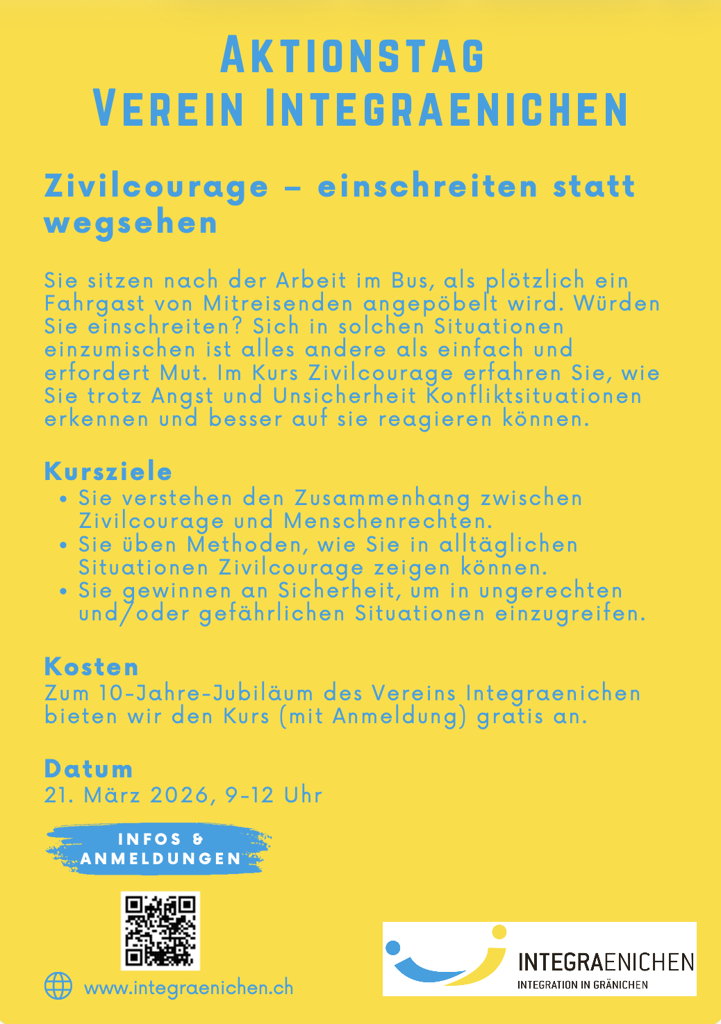 Zum 10-Jahre-Jubiläum des Vereins Integraenichen bieten wir den Kurs (mit Anmeldung) gratis an.